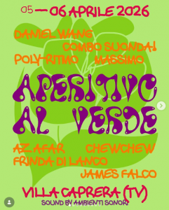 6 aprile – PASQUETTA 12.00 – 23.00 FRINDA DI LANCO POLY-RITMO CHEWCHEW FRINDA DI LANCO COMBO SUONDA! live AZ AFAR bbq (12.00-16.00) food area (17.00-23.00) kids area (12.00-21.00) biglietti https://aperitivoalverde.produzioniprivate.it/